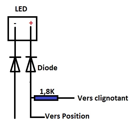Tu mets une diode sur chaque fils + pour éviter les retours et une résistance sur le fil du clignotant (avant ou après peu importe), ensuite tu les rejoins sur la borne + de l'ampoule.