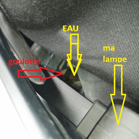 Qd grosse pluies de l eau s infiltre sur le planché derrière les sièges. Problème trouvé aujourd'hui c est le bac à eau de la capote qui s écrase au niveau des ailes arrières et du coup l eau passe par dessus du bac car le troup d évacuation ce retrouve plus haut que la bâche.