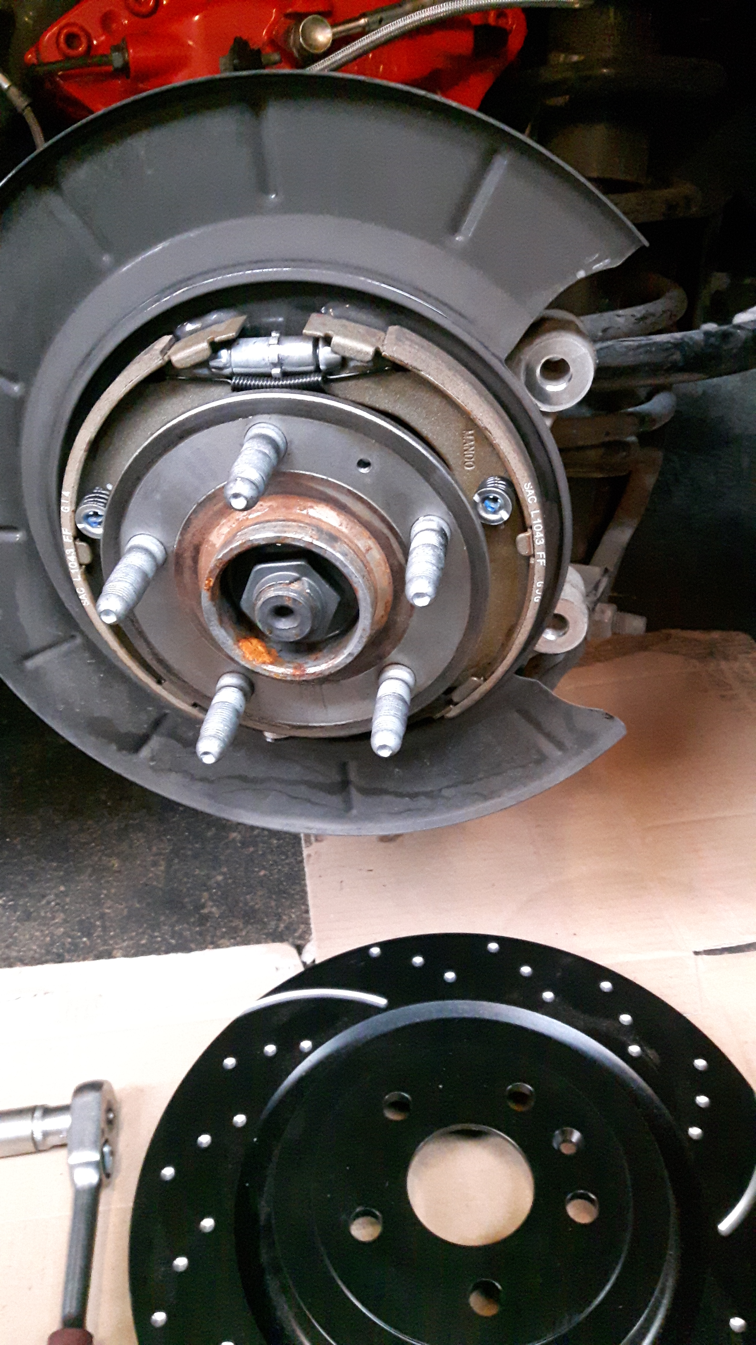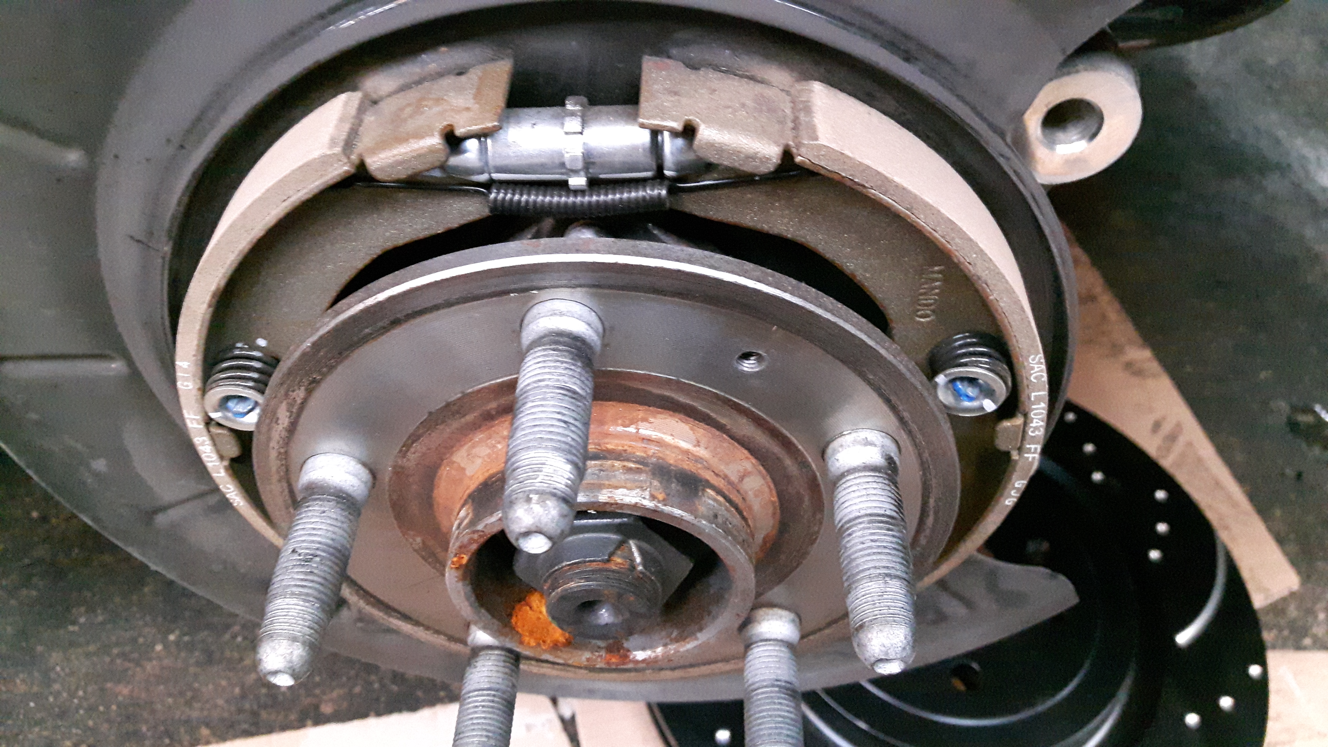 Pour info, le système de frein à main se situe dans le disque lui même, y compris le réglage (voir molette canelée au centre, sur les photos). Cela se présente sous la forme de fines garnitures (genre mâchoires de frein à tambours), et cela sous-entend surtout que, comme toutes mâchoires, eh bien cela va s'user avec le temps, même modérément car cela ne concerne QUE le frein à main. Mais à savoir...