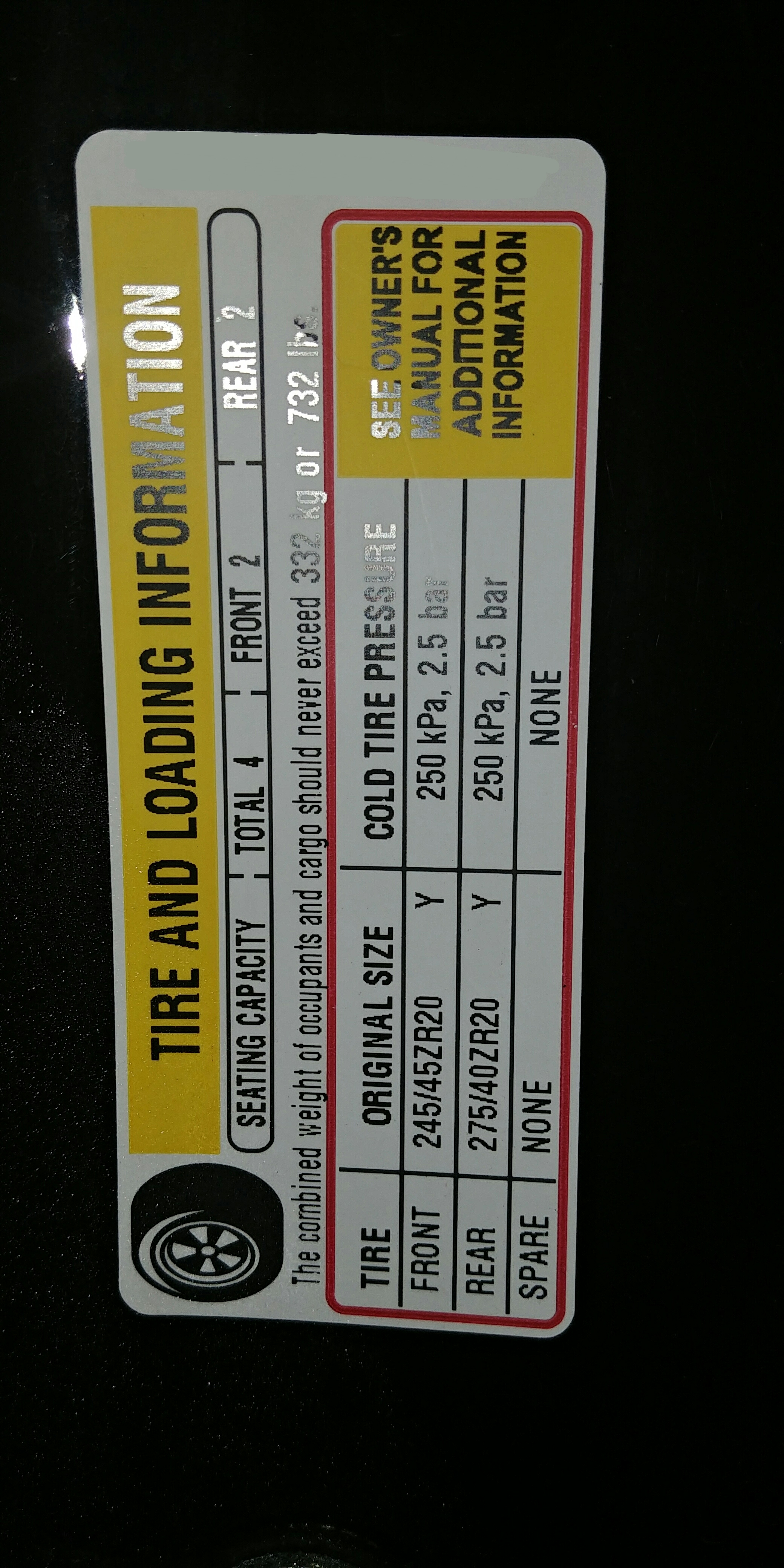 Qui aurait la gentillesse de poster la photo de son étiquette constructeur où on retrouve la pression des pneus, charge, etc.?