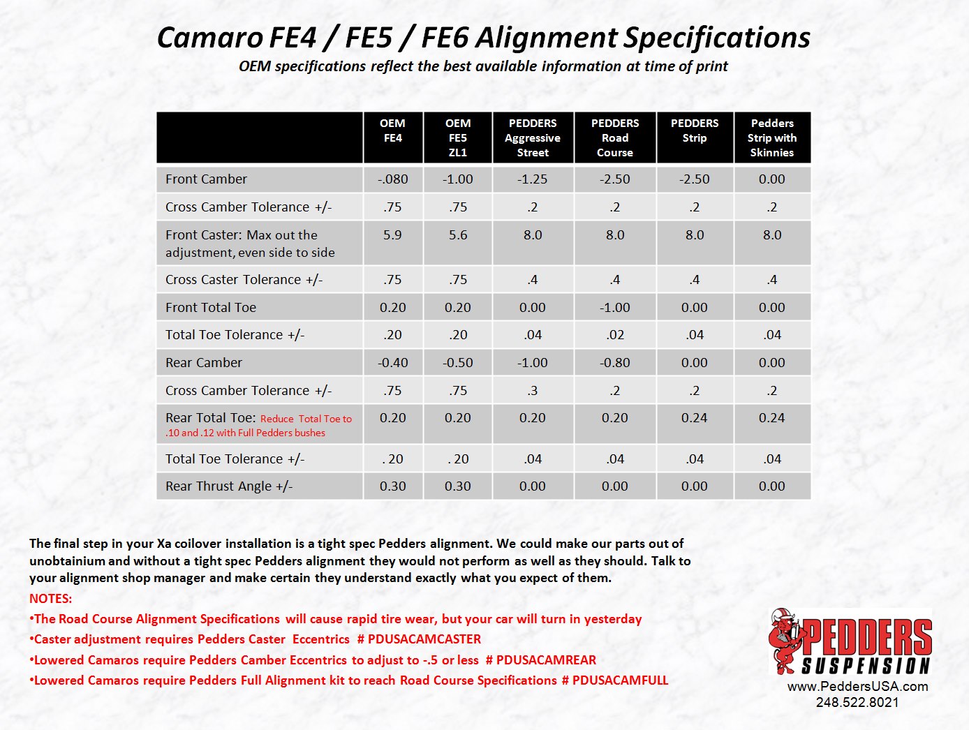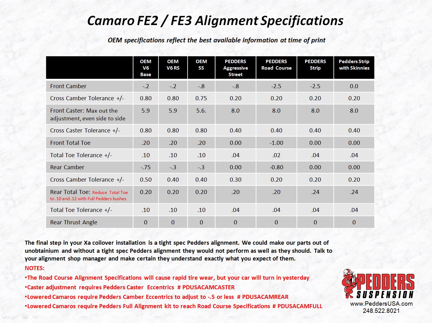Pour contrôler la géométrie de votre Camaro, les professionnels se réfèrent aux valeurs dont ils disposent dans leur banque de données de leur logiciel, ceci dit il se peut qu'ils n'aient pas les valeurs de la version FE4 qui concerne les Camaro EU.