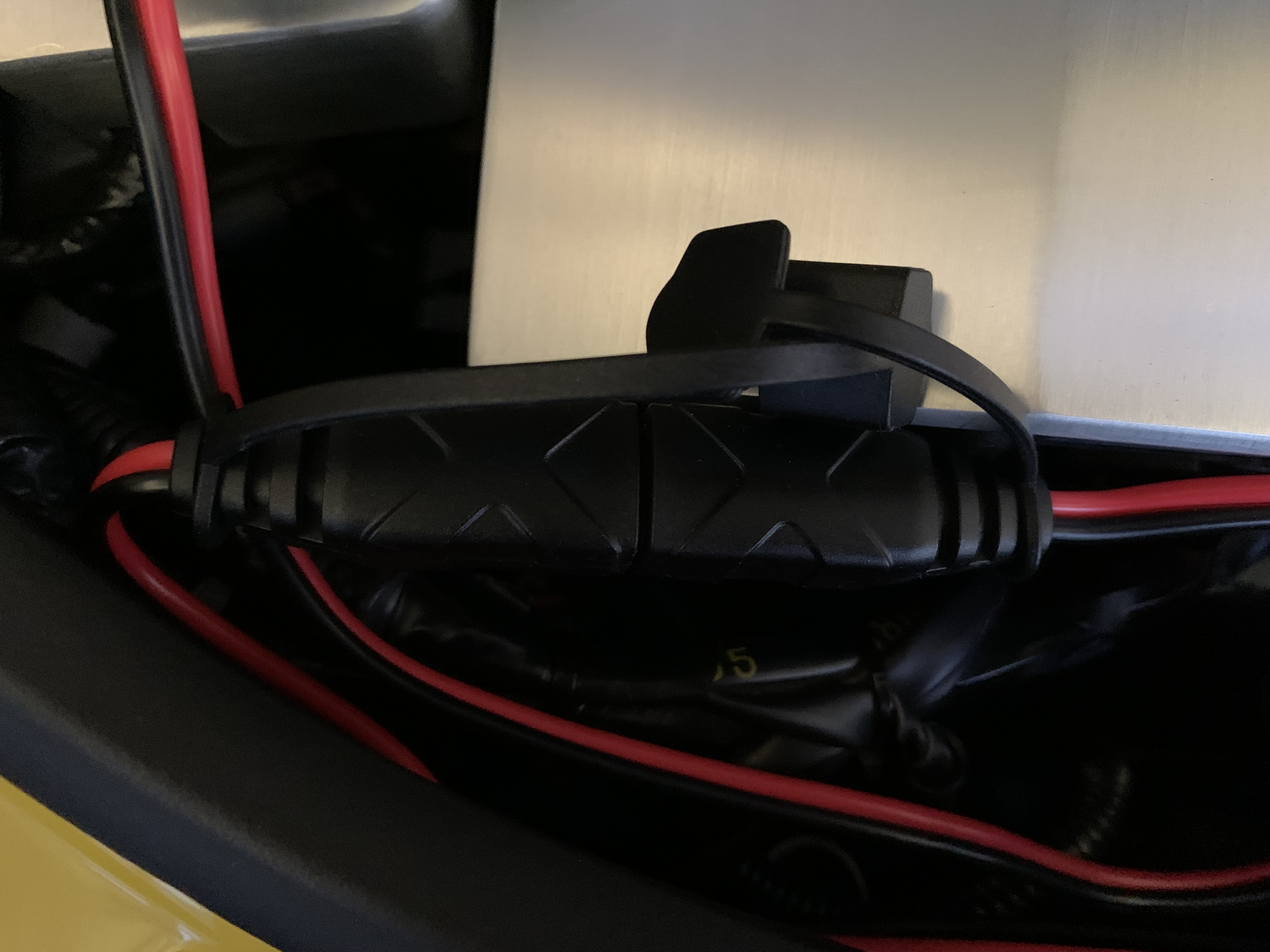Ensuite il ne vous reste plus qu'à bien ranger le connecteur qui sert a brancher le chargeur, comme ca plus besoin de pinces ou d'ouvrir le coffre pour aller se brancher directement sur la batterie, quoi qu'il est plus simple de mettre les pinces sur les plots prévus à cet effet dans le compartiment moteur.