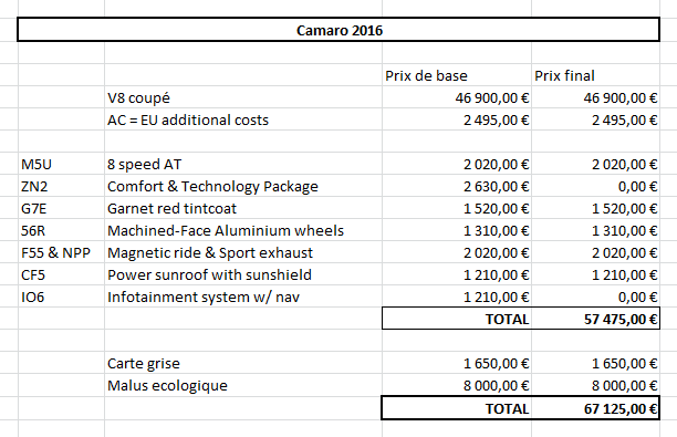 Re: La camaro 6 En france : Detail des tarifs