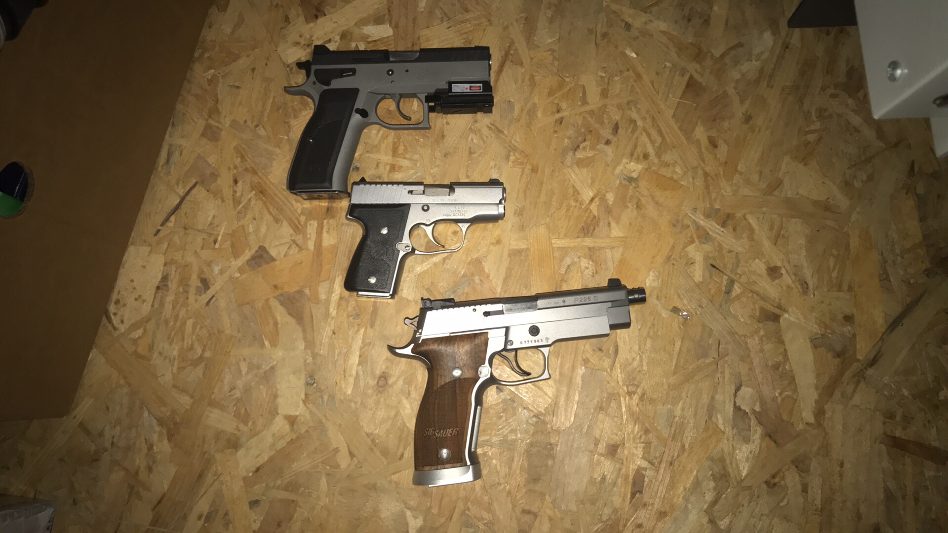 Alors pour le port discrètement dissimulé auquel tant les Suisses et les Français n’auront jamais droit mais dont je m’en tape car à la première merde qu’il se passera chez nous, pas une de mes femmes ne sortira sans un truc dans son sac à main ni moi sans en avoir un à la cheville ou dans un étui dorsal j’ai actuellement ces quelques bricoles avec de gauche à droite en partant du haut le HS-9 Croate (existant aussi en version Ricaine chez Springfield avec le XD-9), ensuite vient mon préféré, le S&W MP-9C, le SIG P232 en 7,65 Br (existe aussi en 9 court), le Steyr S-9A1, le Pocket SIG Sauser P238 en 9 court qui est à peine plus grand qu’un paquet de clopes, le légendaire Walter PPK (9 court et 7,65 Br), et enfin, le tout nouveau SIG P320 (couleur TAN) qui vient d’etre adopté par l’armée US en remplacement du Beretta M9, la, je l’ai en version compact mais il existe en version full site de 5" et subcompact en 3", ce P320 est d’ailleurs le tout dernier que j’ai acheté avec le Sphinx SDP car son système de détente m’a bluffé.