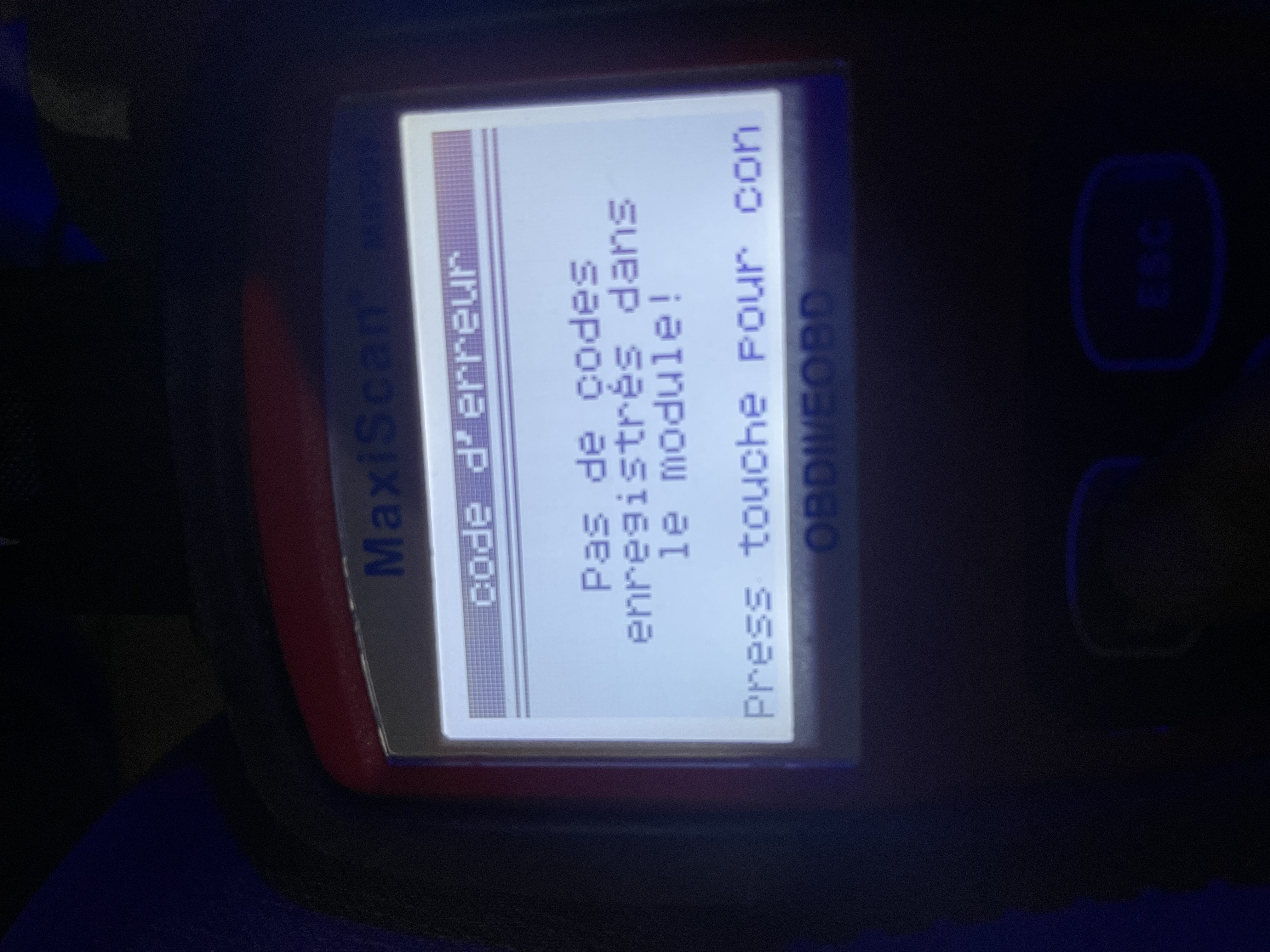et suis descendu brancher ma caisse sur le lecteur de codes que j’ai, résultat: 0 codes… (juste 2 séries qui ne correspondent pas à des codes d’erreur sur la deuxième photo et dont je ne sait pas à quoi ils correspondent) tant mieux mais ça ne me dit toujours pas de quoi ça pourrait venir, bon, là période pourrait jouer avec le remplacement de mes clefs, alors je ne sait pas, je vais appeler le concessionnaire qui a effectué le rappel et lui poserait la question.