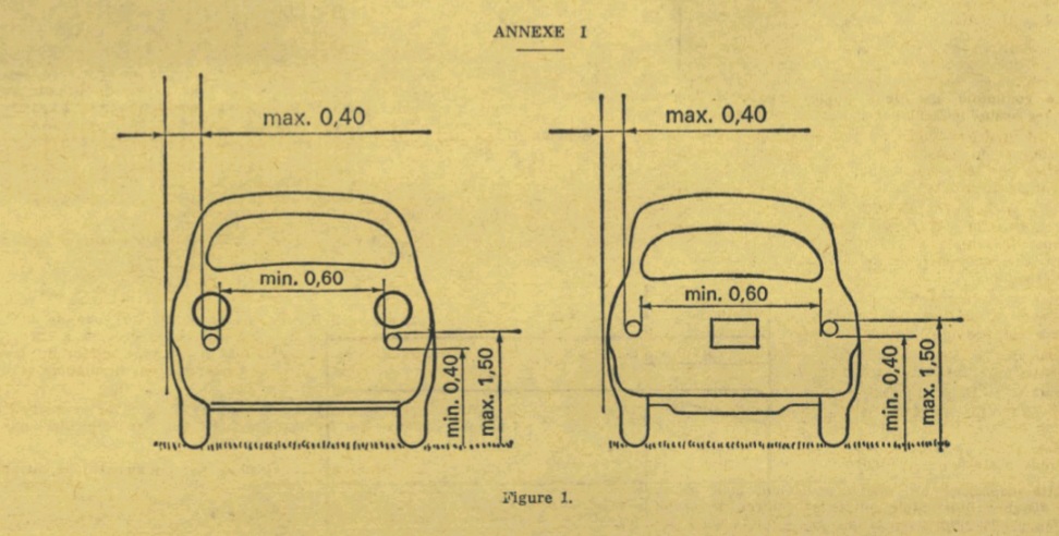 Chaque appareil doit être placé le plus près possible de l'extrêmité de la largeur hors tout du véhicule. En tout cas, la distance entre le bord extérieur de la plage éclairante de chaque appareil et l'extrêmité de la largeur hors tout du véhicule ne doit pas dépasser 0,40 mètre; en outre, la distance entre les bords intérieurs des plages éclairantes des deux appareils correspondants ne doit pas être inférieure à 0,60 mètre
